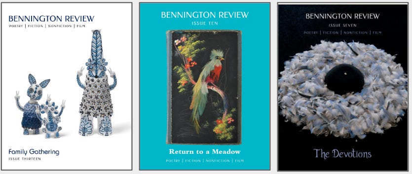 Each issue of Bennington Review has a theme. These are not stated themes to which submitters should match their work. Rather, the themes form over the course of accepting work and the issue is coming together. Don’t worry—work is never rejected because it doesn’t match a theme. Excellence is always paramount. Past themes include “the health of the sick,” “family gathering,” “staying alive,” and more.